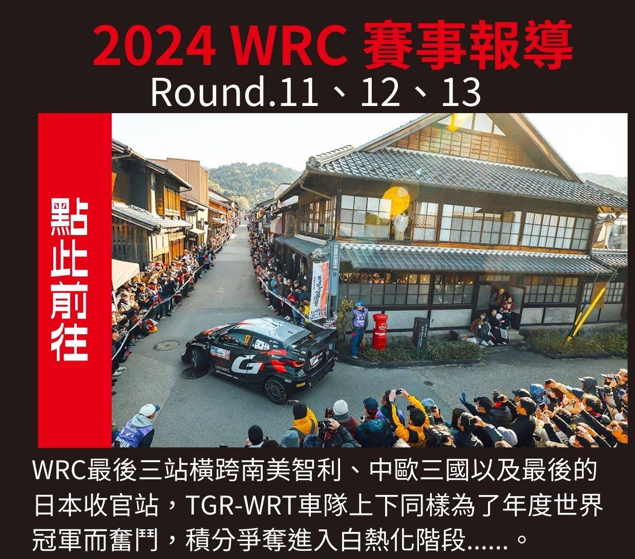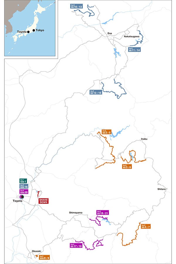 2024賽季的收官站來到日本拉力賽的主場道路上最後一次決勝負。在本賽季當中TGR-WRT車隊已在12場拉力賽中七度摘下勝利,有望在最終站角逐連續四次獲得製造商冠軍的頭銜。Service Park就設立在名古屋的豐田體育場,此地在本周末也將舉行包含開幕賽段在內的三次SSS賽段。而本站也是第二回在這片橫跨愛知縣與岐阜縣的森林中舉行比賽,狹窄曲折的柏油鋪面是其主要的賽道特徵。去年也同樣在此地,Elfyn Evans、Sébastien Ogier以及地主車手勝田貴元共同做出了1-2-3名完全佔領頒獎台的壯舉,今年TGR-WRT亦是以相同陣容,試圖以精采大結局結束2024賽季。