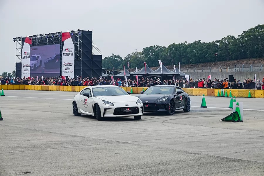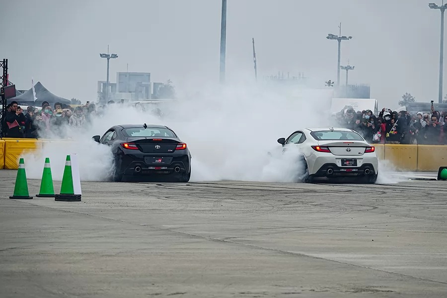 此時另一端原先正提供民眾體驗金卡納的場地裡似乎又引起一番騷動……趨前一看,只見廖君豪、戴曉祥兩位車手分別跳上一黑一白的GR86,一個燒胎起步就展開甩尾大秀,從單車solo、雙車追走,到最後身兼賽車手的主持人Iris也下場秀一段,從俐落的反打飄移、到表演高潮時兩車同時揚起的漫天白煙,無不讓現場所有舉著手機的觀眾看得目瞪口呆、嘴角露出孩子般藏不住的微笑。