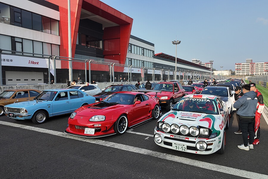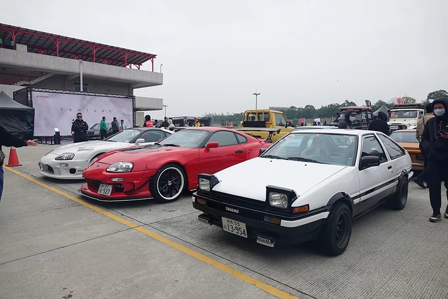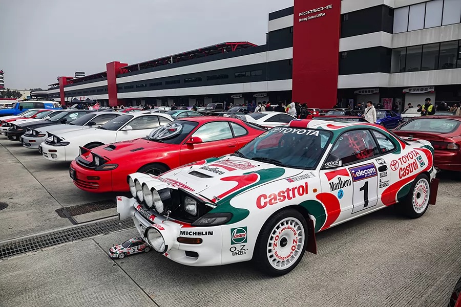 不過,車庫後的集車區更有百台TOYOTA經典車輛的精彩車聚。是的,在經典90的號召下,你能在此看到漫畫裡的熊貓色AE86,比鄰著以電影《玩命關頭》紅遍整片天的A80 Supra,此外還有還原《頭文字D》裡小柏健開的藍色MR2,以及日劇《東京愛情故事》裡江口洋介開的A70 Supra。跳脫影視作品,在後方四代同堂的Celica陣中有車主悉心整理成90年代初期叱吒WRC賽場、身披嘉實多紅綠白塗裝、足蹬白色OZ拉力框的Celica T180;而身為越野人心頭寶,兩輛裝上門軸、大腳的Land Cruiser J40、J70的高䠷姿態,則與遠處的00世代代表:FJ Cruiser相映成趣。