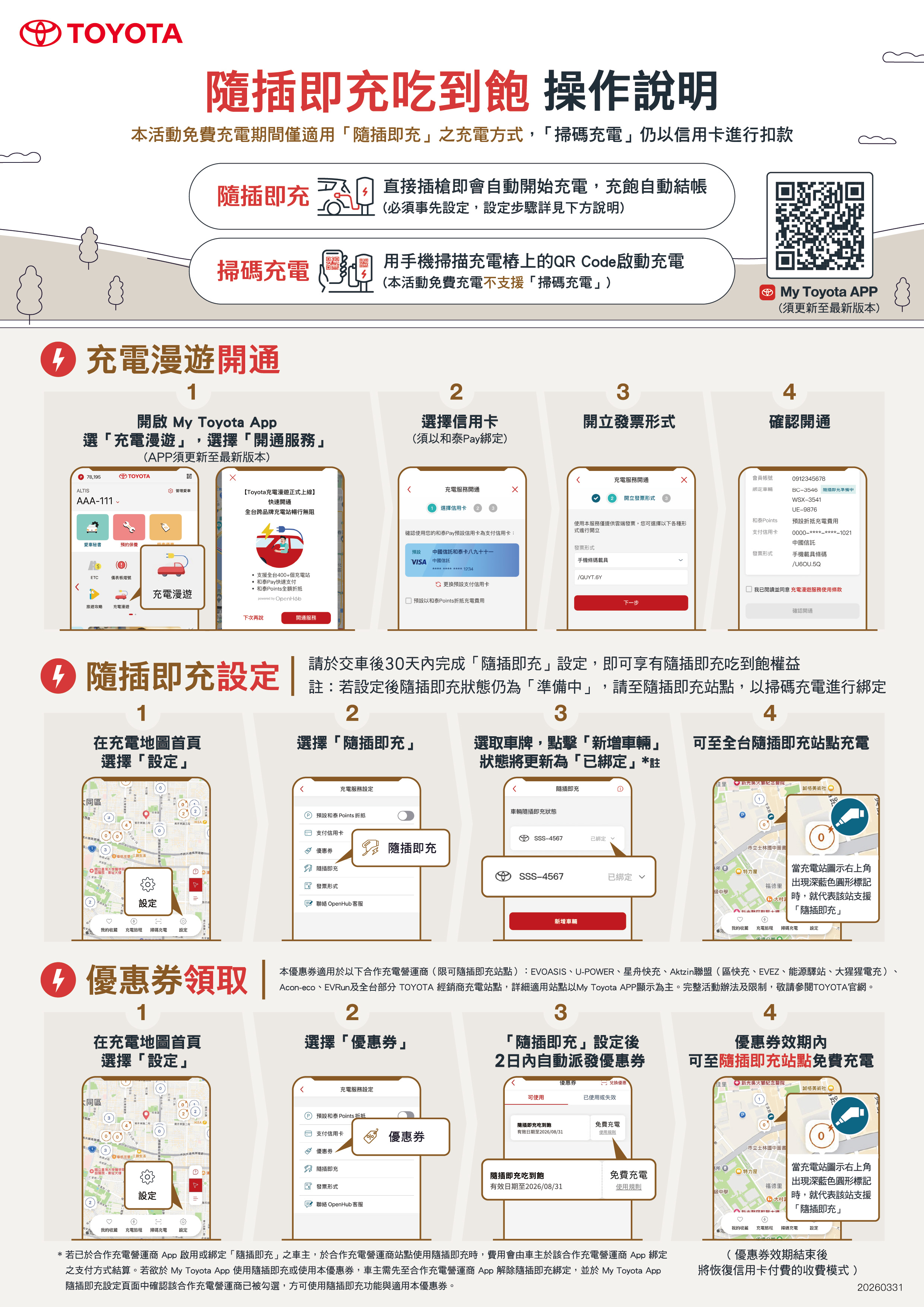 *3若已於合作充電營運商 App 啟用或綁定「隨插即充」之車主,於合作充電營運商站點使用隨插即充時,費用會由車主於該合作充電營運商 App綁定之支付方式結算。若欲於My Toyota App 使用隨插即充或使用本優惠券,車主需先至合作充電營運商App解除隨插即充綁定,並於My Toyota App 隨插即充設定頁面中確認該合作充電營運商已被勾選,方可使用隨插即充功能與適用本優惠券。
